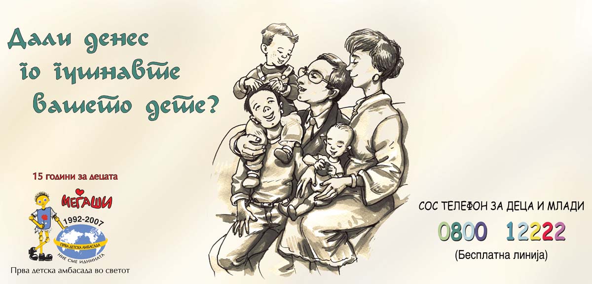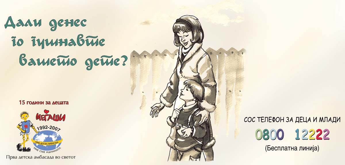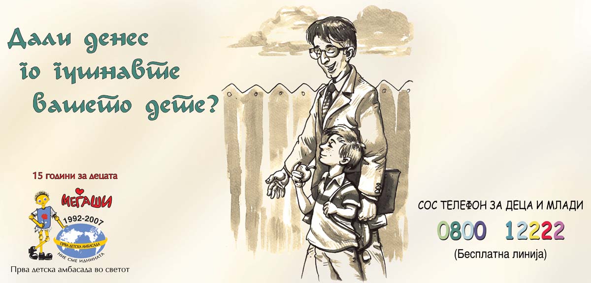 СТОП! На насилството врз децата Првата детска амбасада во светот – Меѓаши започна со кампањата против насилството врз децата во Македонија. Потикнати од последните претепуванја на две деца до смрт и поразувачкиот пораст на бројот на јавувања поврзани со насилство (18,6% во 2006 за разлика од 2% во 2000 година) на СОС телефонот за деца и млади 0800 1 22 22 (бесплатна линија), одлучивме да стартуваме со кампања за подигање на свеста за потребата од застита на децата од секаков вид на насилство, како и потикнување на граѓаните да го пријават насилството. Распоредени на различни локаци околу центарот на Скопје, веќе една недела можат да се забележат 15 билборди со различни пораки: “Дали денеска го гушавте вашето дете?” и "СТОП! На насилството врз децата”.