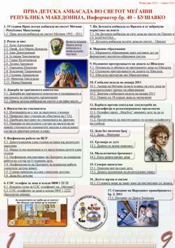 2. Рекоа за нас: 3. Доверба во граѓанското општество 4. Насилство во училиштата 5. Неефикасна работа на ЦСР 6. СОС телефон за деца и млади 0800 1 22 22 7. На Детската амбасада од Прилеп и се забранува користење на името 8. Мировно образование 9. Одложено протерувањето на децата од Шведска 10. Глобална недела на акција 2011 11. Борбата против сексуална злоупотреба на деца,педофилја и родосквернавење продолжува 12. Деца без матичен број 13. Трговија со луѓе 14. Малолетничка бременост 15. Семејно насилство 16. Детето жртва и сведок 17. Списание на Народниот правобранител бр. 3, 2011. Випро ја поддржа Првата детска амбасада со 1 денар од купен производ |