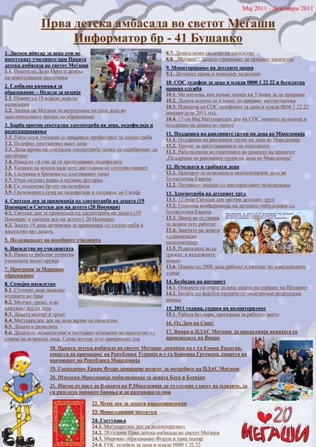 Во најновиот број на електронскиот информатор на Амбасадата БУШАВКО бр 41 (Мај 2011 - Декември 2011) можете да ги прочитате следните содржини: