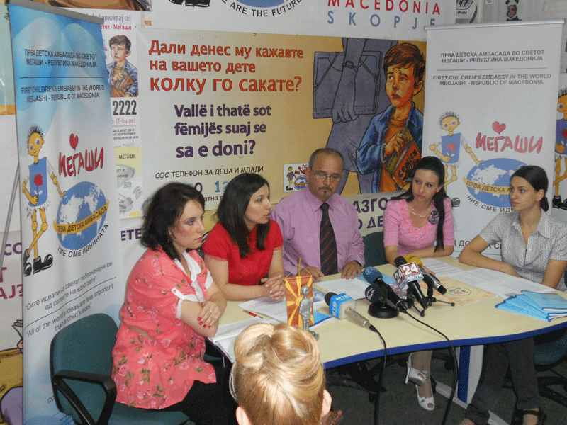 At the press conference was discussed more about the situation of the children in Macedonia, as well as recommendations arising as a conclusion of the preparation of the report. Press opening statements: 10:30-10:40 MA Dragi Zmijanac - Executive Director and Founder of the First Children’s Embassy in the world Megjashi. He spoke about the recommendations of the Civil Society Organizations to the Committee on The Rights of the Children regarding better implementation of the Committee on The Rights of the Children. 10:40-10:50 Katerina Koneska - Program Manager at the First Children’s Embassy in the world Megjashi., she spoke about the way of preparing and the content of the Report for the condition of the children’s rights. 10:50 to 10:55 Radmila Stojkovska Aleksova - special education teacher in the "Open the windows," spoke about the data that participated in "Open windows" in the preparation of the report 10:55 to 11:00 Marija Matovska - Project Coordinator, Association for Health Education and Research "HERA" spoke about the data that participate "Hera" in preparing the report 11:00 to 11:10 Questions Moderator: Katerina Koneska - Program Manager of the First Children Embassy in the World Megjashi The report is a review of the situation of children in Macedonia for the period from June 2010 to December 2011. The report was prepared by monitoring the implementation of the Convention on the Rights of the Child, the implementation of the recommendations that came from the United Nations Committee on the Rights of the Child in June 2010 and implementation of other international instruments which regulate the rights of children. The previous report prepared by the Macedonian national coalition is rated by the UN Committee as suitable for monitoring the situation of children's rights by civil society. Therefore in this report the collected data was processed and presented in accordance with the structure that is recommended by the Committee on the Rights of the Child. In order to have a more complete picture of the respect and rights of children in Macedonia, the National Coalition, starting this year, prepare annual reports that will be the basis for the next periodical alternative report. The preparation of the report is part of the project "Strengthening the capacity of NGOs to monitor children's rights," funded by UNICEF.