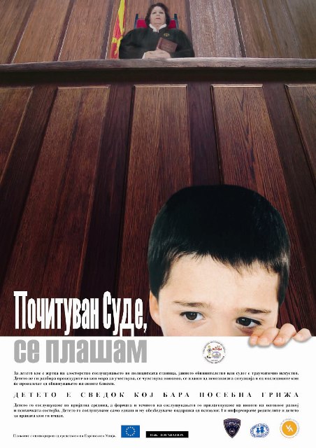 Детето-сведок која бара посебна грижа Во периодот ноември - февруари продолжија активностите поврзани со проектот “Детето-сведок која бара посебна грижа”. Се направи адаптацијата на постерот “Почитуван суде, се плашам” и брошурата “Јас одам во суд” и се очекува во март да бидат испечатени. Постерот и брошурата ќе бидат дистрибуирани до судовите и полициските станици бидејќи се наменети токму за професионалците кои работат со деца сведоци.