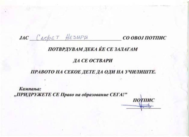 На 22 април во 13:30 часот 50 деца остварија средба во Собранието на Република Македонија со г-дин Сафет Незири, Претседателот на Собраниската комисија за образование, наука и спорт. Децата разговараа и поставуваа прашања во врска со образованието и за тоа што тој може да направи за децата кои не одат на училиште. Исто така децата побараа од Претседателот на Собраниската комисија да ја потпише писмената гаранција дека во текот на својот мандат ќе се залага да се оствари правото на секое дете да оди на училиште. Гаранцијата е прикачена во прилог