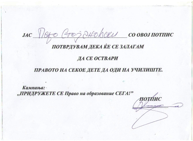 Истиот ден  децата остварија средба и со г-дин Перо Стојановски министерот за образование и наука. На оваа средба децата  имаа можност да поразговараат со Министерот за значајноста на образованието, како и да му поставуваат прашања за тоа што тој како Министер може да направи и ќе направи за сите деца кои не одат на училиште. Децата побараа од Министерот да објасни што тој до сега има направено во однос на залагањата за кои веќе ја има потпишано гаранцијата да се оствари правото на секое дете да оди на училиште. Види прилог гаранција..ѓ