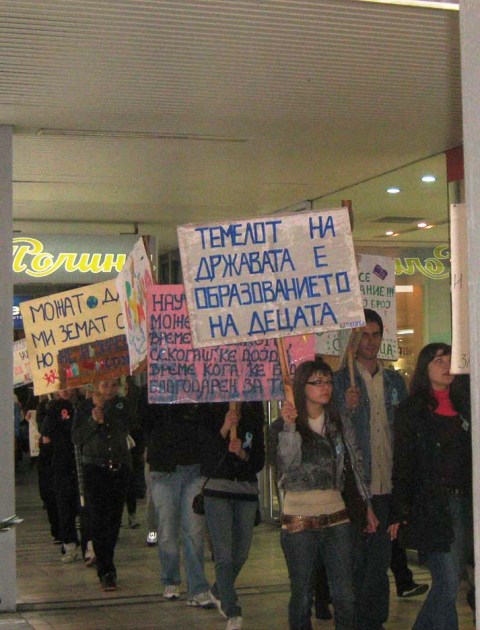 На Плоштадот децата со транспаренти со испишани пораки за правото на сите деца на образование и писменост, мирно маршираа во знак на солидарност со сите деца на светот кои не одат на училиште и кои не знаат да читаат и пишуваат. Во светот има 774 милиони возрасни и 75 милиони деца кои не знаат да читаат и пишуваат. Во Македонија има над 18.500 деца кои не одат на училиште, од кои 2000 деца се на улица. Во Македонија 200.000 возрасни немаат завршено основно образование.