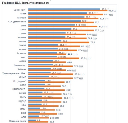 Освен Црвен крст, кого го познаваат големо мнозинство граѓани и Мост, Меѓаши, СОС Детско село, ЗНМ и ХКЧП, кои ги познаваат мнозинство граѓани, останатите организации ги познаваат помалку од половината граѓани.