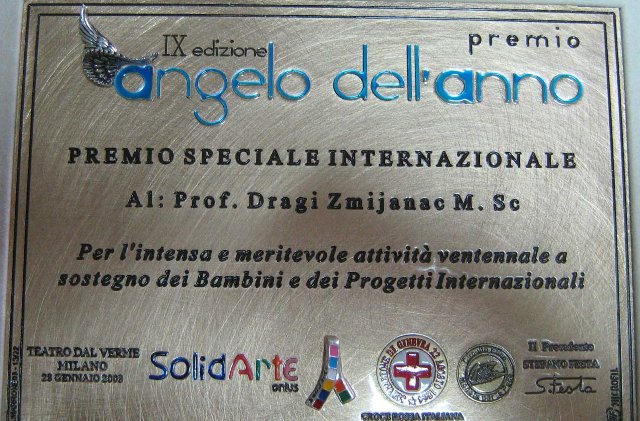 Assigned high recognition to The Executive Director of the First Children’s Embassy in the World Megjashi, Mr. Dragi Zmijanac-“ Angel of the year 2008”On 28th January 2008 year, for the ninth time in the Theatre „Dal Verme” in Milano, was held the manifestation “Angel of the year” organised by the Red Cross Italy – Regional Committy of Lombardy and the Ethic center “Coin for peace”.