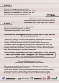 With an intention to encourage the children, the parents, the neighbors, and the closest ones not to be quiet about any form of violence but to report it, we start with the campaign Notice it, hear it, say it. Subsequently, the intention is to influence the creation of better parenthood and to raise the awareness for the need of support and help for the children. Because of this the campaign’s motto is The parents who beat their children want to hide that.