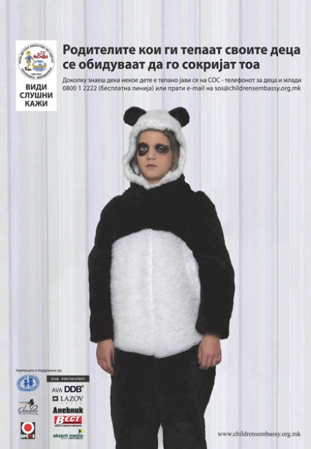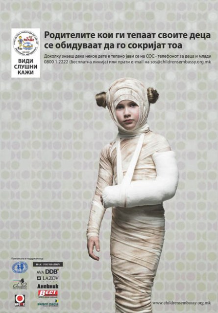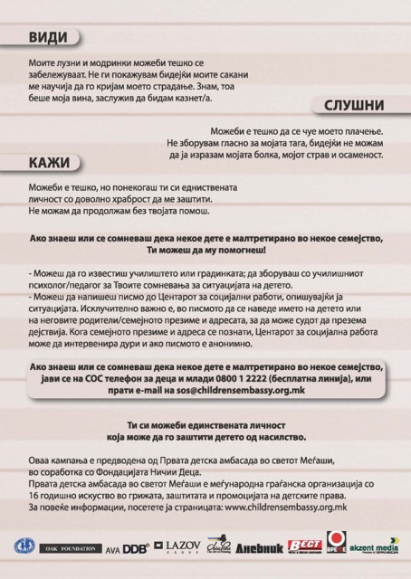 The campaign is a part of the international project Childhood without violence – towards a better system of child protection in Eastern Europe, which in Macedonia was implemented by the First Children’s Embassy in the World Megjashi, in partnership with the Foundation No Ones Children, and supported by ABA DDB, Akcent Media, Data Pons, Lazov Group, Dnevnik, Vest and Vreme.