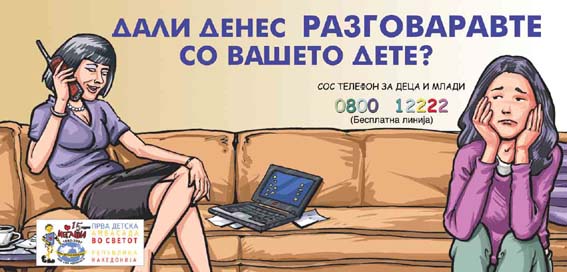 This year the campaign is also conducted in partnership with Accent Media that handed over 60 locations throughout R. Macedonia for placing the billboards. Illustrations are made by Smile Cvetanovski, an illustrator. The data from our SOS phone number for children and youth 0800 12222 (toll-free) show that the children are more and more and lonely and detached. That parents pay them less and less attention and devote less time to talk to them.