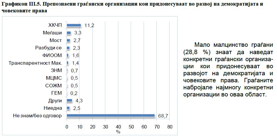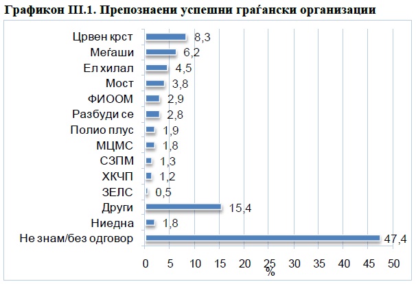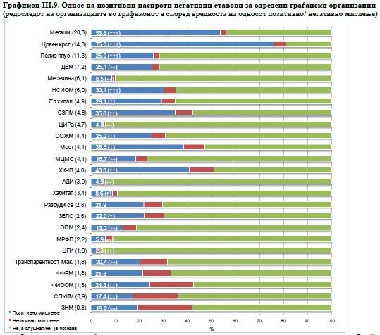 In the research dedicated to the “Confidence in the civil society” and “The familiarity with the civil organizations and the opinions for them”, the First Children’s Embassy in the World Megjashi according to the interviewed persons is on the following positions: