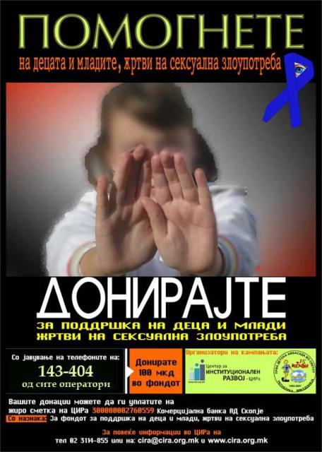 Услуги за помош на децата и младите (правна помош, стручна психолошка помош, итн); Производи за помош на децата (играчки, облека, обувки, учебници итн). итн. 5. Волонтирање за поддршка на камањата и/или организирањето на настаните за прибирање средства (отворено студио со звезди и хумантирен концерт) кои ќе се одржат на 19 ноември 2008 Ве покануваме активно да се вклучите во оваа кампања која ќе трае до крајот на ноември 2008. Ве молиме повикајте ги членовите на вашите семејства, вашите пријатели, колеги и деловни партнери да ја поддржат оваа граѓанска иницијатива и да дадат свој придонес за успешно справување со сексуалната злоупотреба на децата и младите. Испратете го овој e-mail до нив или разговарјте со нив за поддршка. Доколку имате било каква идеја која ќе придонесе кон успешно спроведување на кампањата, слободно предложете ја! Секоја иницијатива е добредојдена!!! Постојат и други можности за да поддршка на иницијативата за креирање фонд за поддршка на децата и младите жртви на сексуална злоупотреба, со кои ќе може да се запознаете на интернет страницата на ЦИРа : www.cira.org.mk За сите ваши прашања и идеи поврзани со донирањето во фондот, слободно контактирајте не во ЦИРа или Меѓаши на долунаведените контакти. ЦИРа како организација која работи на промоција на Законот за донации и спонзорства во јавните дејности (ЗДСЈД), ви нуди поддршка за спроведување на процедурата за користење на даночните поттикнувања. На секои 2 недели ЦИРа и Меѓаши ќе објавуваат информации поврзани со собраните средства, ревидираната листа на подрржувачи, како и активностите кои ќе се превземаат понатаму, на интернет страниците www.cira.org.mk, и www.childrensembassy.org.mk, со соопштенија за јавност и преку електронска пошта (доколку не сакате понатаму да примате информации поврзани со оваа кампања, слободно испратете ни барање за бришење од е-маил листата на ЦИРа за овој Фонд). Станете и Вие активен поддржувач на кампањата и кажете СТОП за сексуалната злоупотреба на децата и младите. Ви благодариме на вашата грижа за децата и младите - жртви на сексуална злоупотреба во Македонија. Донирајте во Фондот за нивна поддршка!