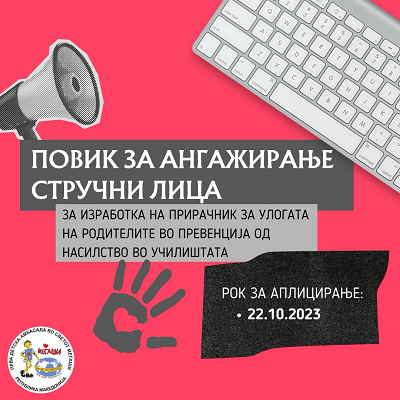 ПОВИК ЗА АНГАЖМАН НА ДВЕ СТРУЧНИ ЛИЦА ЗА ИЗРАБОТКА НА ПРИРАЧНИК ЗА УЛОГАТА НА РОДИТЕЛИТЕ ВО ПРЕВЕНЦИЈА ОД НАСИЛСТВО ВО УЧИЛИШТАТА