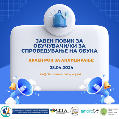 Првата детска амбасада во светот Меѓаши објавува повик за двајца/две обучувачи/ки за спроведување тридневна обука во два циклуса за унапредување и зајакнување на вештините и знаењата на стручните соработници во основни и средни училишта. Фокусот на обуката ќе биде зајакнување на капацитетите на членовите од стручните тимови преку обработка на две тематски целини насочени кон развој на безбедна училишна средина: