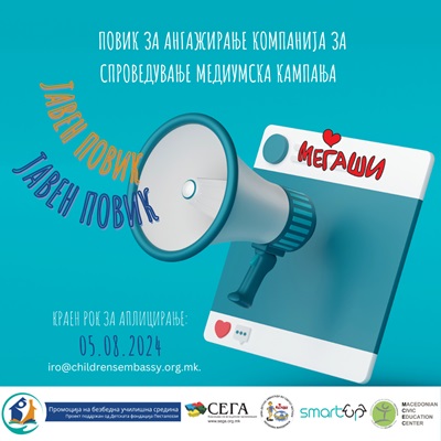 Првата детска амбасада во светот Меѓаши објавува повик за ангажирање медиумска/маркетинг агенција која ќе биде одговорна за креирање и спроведување кампања што ќе промовира детско учество и ненасилство и ќе влијае на создавање безбедна средина во училиштата. Кампањата ќе биде предводена од ученици кои со поддршка од агенцијата и во соработка со тимот на детската амбасада Меѓаши ќе ги керираат потребните материјали, план и канали на комуникација.