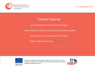 Kemi kënaqësinë t'ju ftojmë në konferencat lokale në Dibër, Kisella Vodë, Gostivar, Veles dhe Vinicë në kuadër të projektit "Vendi për t'u rritur: Komunat kushtuar fëmijëve".